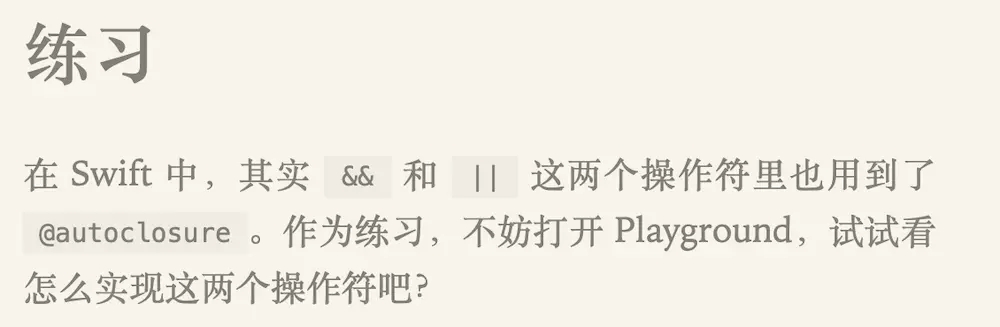 这种方式只是在第二种方式的写法上进行了优化,即在闭包参数的前面加了@autoclosure关键字,作用就是在调用这个函数的时候,写法非常优雅,你甚至都感受不到闭包的存在!代码如下: