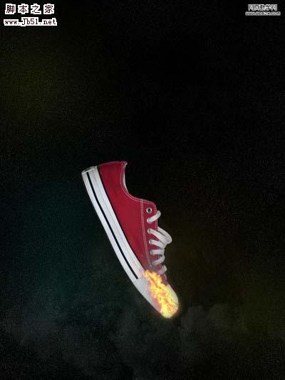 9、现在在新的顶层上粘贴火焰的图片。接着调整大小/旋转图像将它放置在鞋尖的趾头的位置。使用一个软橡皮擦修改使它更加适合鞋子。复制火焰图层3次使火焰效果更加强烈然后向下合并这样只有一个一个火焰图层。