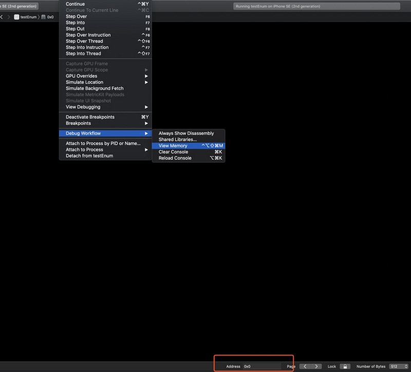 点击Xcode菜单栏中的Debug -> Debug Workflow -> View Memory,然后在下面红色框中输入变量的内存地址,就可以看到变量的内存使用情况。