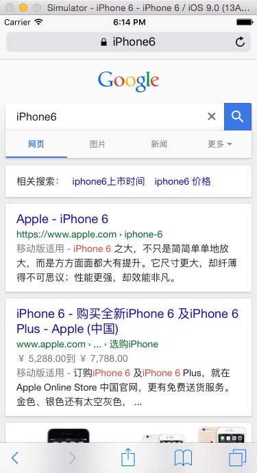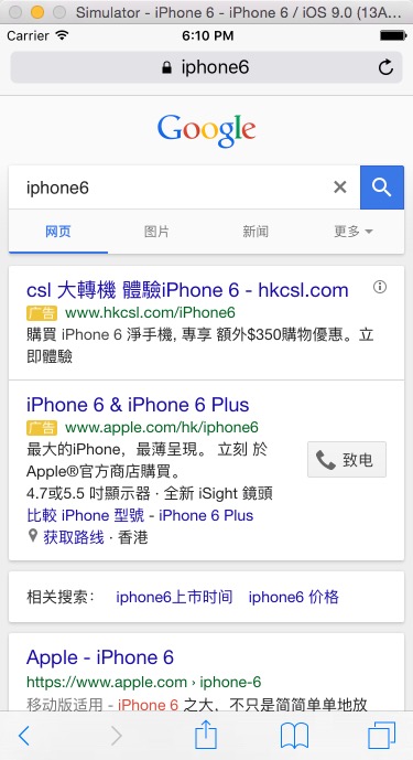 在使用Google搜索时,排行靠前面的几条永远都是广告项,比如搜索“iPhone6”,得到的结果如图1所示: