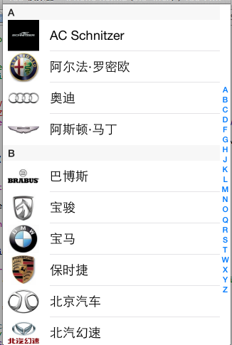 上次介绍的UITableView,这里再做一个UITableView的小程序,汽车品牌,截图如下: