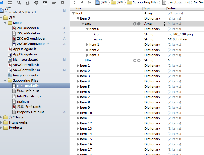 创建的carGroups数组中,而本地的plist文件是一个array类型,而每个array里面又有一个array数组,所以我们要创建两个模型类来保存数据,一个模型类保存外面的array数据,一个模型类来保存array里面的子array数据,然后在模型类里面创建和plist里面对应的数据的属性和方法