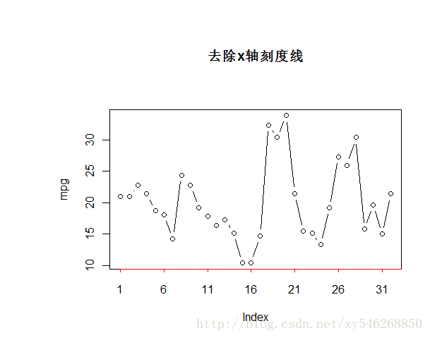 > attach(mtcars) > par(mar=c(5,8,8,2)+0.1)#增加图形边界 > plot(mpg,xaxt="n",type="b",main="去除x轴刻度线")#一定要设置xaxt="n",去除x轴的刻度 > axis(side=1,at=seq(1,40,5),col="red",tck=-0.02)#绘制自己想要的坐标轴