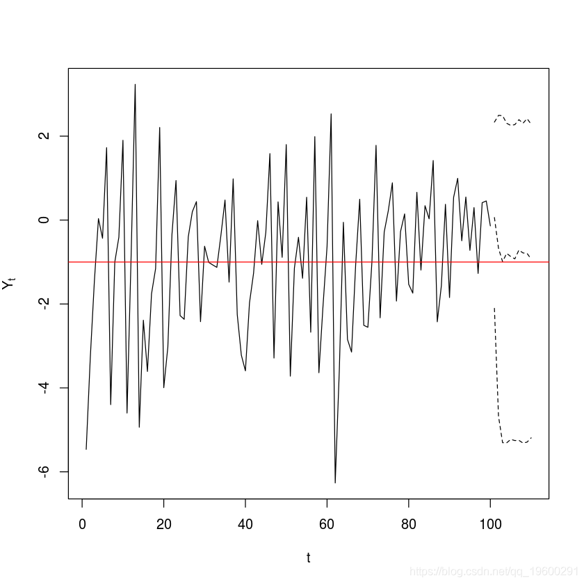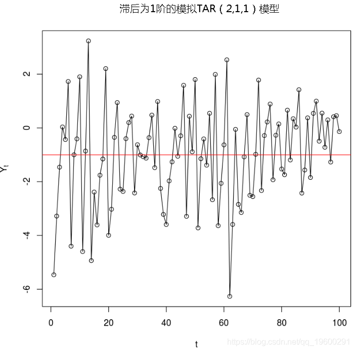 #低机制参数 i1 = 0.3 p1 = 0.5 s1 = 1 #高机制参数 i2 = -0.2 p2 = -1.8 s2 = 1 thresh = -1 delay = 1 #模拟数据 y=sim(n=100,Phi1=c(i1,p1),Phi2=c(i2,p2),p=1,d=delay,sigma1=s1,thd=thresh,sigma2=s2)$y #绘制数据 plot(y=y,x=1:length(y),type='o',xlab='t',ylab=expression(Y[t]) abline(thresh,0,col="red")