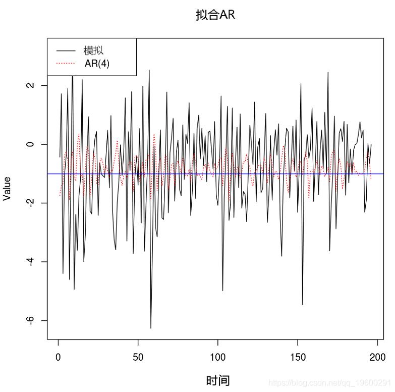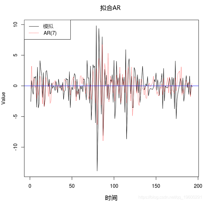 set.seed(12349) #低机制参数 i1 = 0.3 p1 = 0.5 s1 = 1 #高机制参数 i2 = -0.2 p2 = -1.8 s2 = 1 thresh = -1 delay = 1 nobs = 200 #模拟200个样本 y=sim(n=nobs,Phi1=c(i1,p1),Phi$y #使用Tsay的检验确定最佳AR阶数 ord <- Tsay.test(y)$order #线性AR模型 #pacf(sunspot.year) #try AR order 4