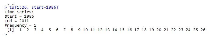 ts(1:26, start=1986) #最简单的形式 Time Series: Start = 1986 End = 2011 Frequency = 1