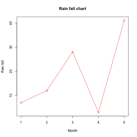 # 向量数据 v <- c(7,12,28,3,41) # 生成图片 png(file = "line_chart_label_colored.jpg") # 绘图、线图颜色为红色,main 参数用于设置标题 plot(v,type = "o", col = "red", xlab = "Month", ylab = "Rain fall", main = "Rain fall chart")