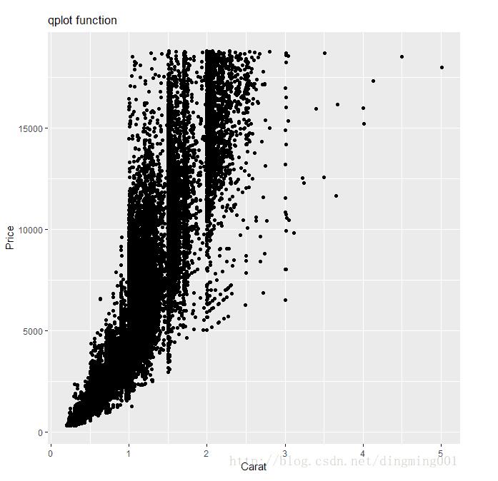 plot(x=datax$carat, y=datax$price, xlab="Carat", ylab="Price", main="plot function") qplot(x=carat, y=price, data=datax, xlab="Carat", ylab="Price", main="qplot function")