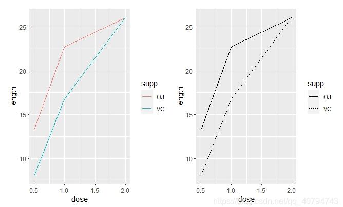 p2 <- ggplot(.,aes(x=dose, y=length, linetype=supp)) + geom_line()