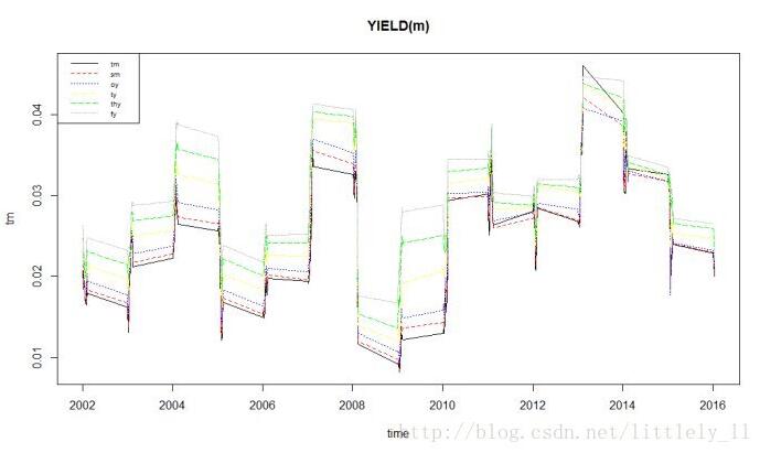 legend("topleft",cex=.6,c("tm","sm","oy","ty","thy","fy"),col=c("black","red","blue","yellow","green","grey"),lty=1:6)