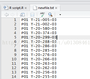 temp<-list.files(pattern="*.xls") //生成一个新变量temp代表文件路径中所有后缀为xls的文件的文件名 head(temp) a=readWorksheetFromFile(temp[1],sheet=1) //读取temp1号excel即P01,命名为数据库a a$plate=substr(as.character(temp[1]),1,3) //生成变量plate,数值为temp里的plate名称(字符1到3) a$id=substr(a[,2],1,11) //生成变量id, 值为第二列数据的前11个字符 ncol(a) //看看a有多少个变量,新生成的plate和id变量为最后两个,假设为第58和59个变量 write.table(a[,c(58,59)],file = "newfile.txt",row.names=F, na="",col.names=FALSE, sep=" ",append = T,quote=F) //生成txt文件newfile.txt为p01文件中的plate和id,展示如下