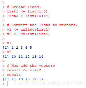 列表可以被转换为一个向量,以便能用于进一步操纵向量的元素。所有关于向量的算术运算可以在列表被转换为矢量之后被应用。要做到这一点转换,使用unlist() 函数。它以列表作为输入,并产生一个向量。