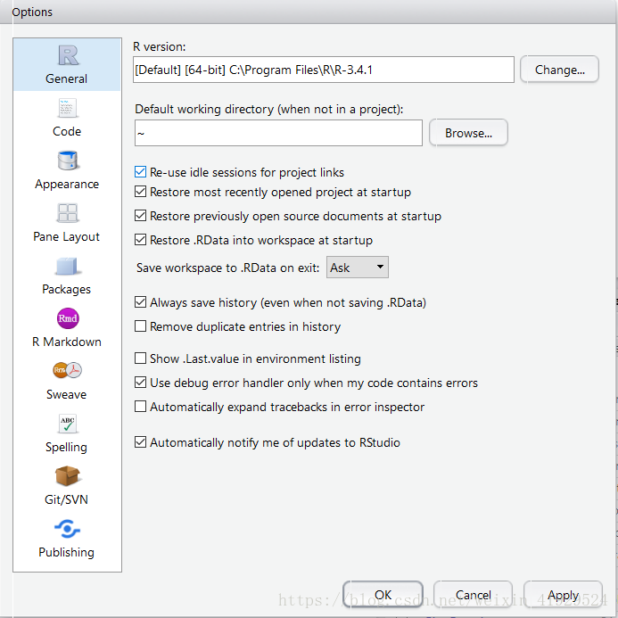 你没有看错,这就是setting界面的全部内容。Language:两种;Skin:两种,能选择的标签页基本都是两种,不能再多了。来对比一下 RStudio 中的设置,高下立判。