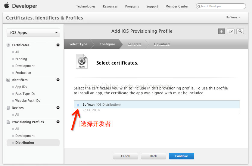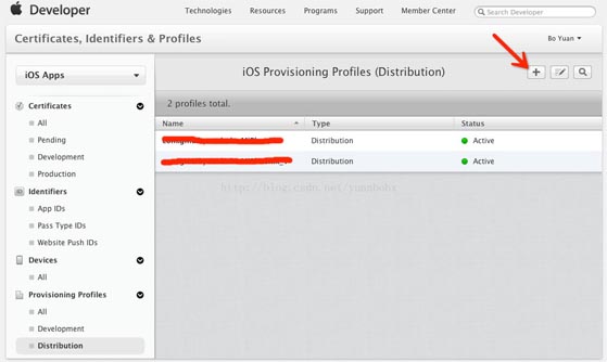点击左侧导航栏Provisioning Profiles中的Distribution,添加一个新的证书