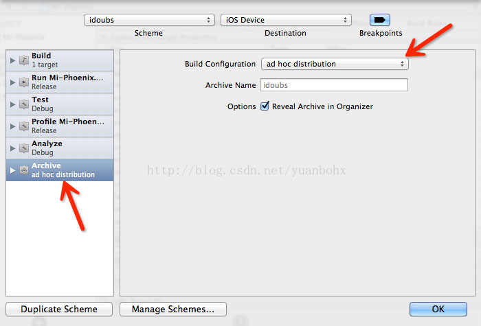 在Xcode左上角run按钮右侧有一个下拉菜单,选择device或者simulator,点击菜单下方的edit schema。保证Archive中Build Configuration中的值是ad hoc distribution