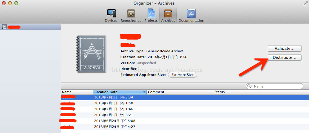 配置工作到此结束。点击Product中的Archive,程序开始编译,编译完成后弹出设置框,点击Distribute...