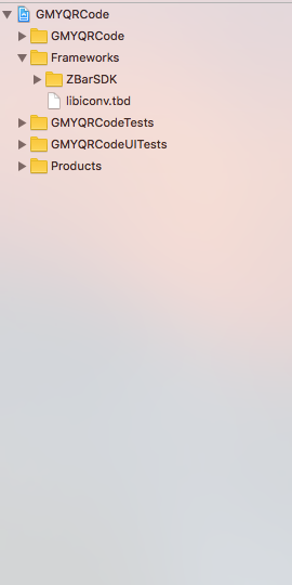 步骤一.在工程中建一个Frameworks文件夹将ZBarSDK文件夹导入,如图