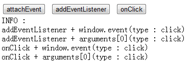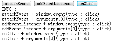 以上代码组合不同的事件监听器绑定方式和事件对象获取方法,测试各浏览器的支持程度。