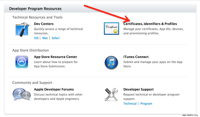 Provider就是我们公司的服务器,经过苹果的APNs服务器找到我们的设备,给我们设备上的客户端应用推送消息。那APNs服务器是如何找到我们的设备和设备上的应用呢,答案就是DeviceToken,DeviceToken需要配置推送证书才可以获得,推送证书需要知道我们的APPID(应用的BundleID,应用唯一标识)和UDID(设备唯一标识),还有自己服务器的UDID,我们先来打一个推送证书,登录开发者中心,点击证书模块