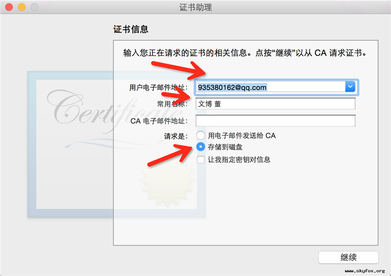 我们需要一个CSR文件,CSR是一个签名请求文件,意思就是让我们的MAC具有调试推送的权限,点击继续