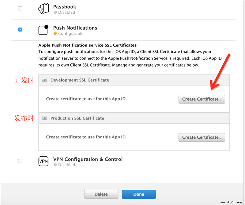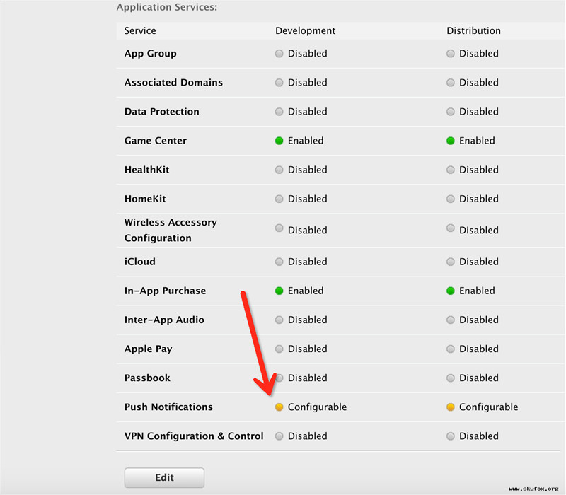 发现Push服务是黄色警告,这时点击Edit,找到推送模块,我们需要配置推送证书了,点击红色箭头所指的位置