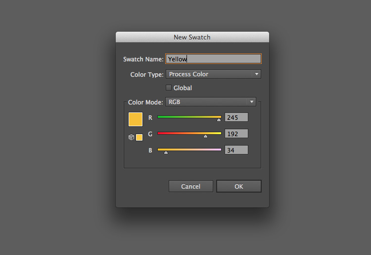 这时你可以创建此次创作所需的第一个色板。(请注意,如果你打算将此次的设计应用于制作印刷品,请从“ 新色板 ”窗口的“ 颜色模式 ”菜单中选择“ CMYK ”色彩模式 。如果你只是打算在电脑上使用它,请选择“ 颜色模式 ”的“ RGB ” 色彩模式,本文中的色彩以RGB色彩模式为标准。)