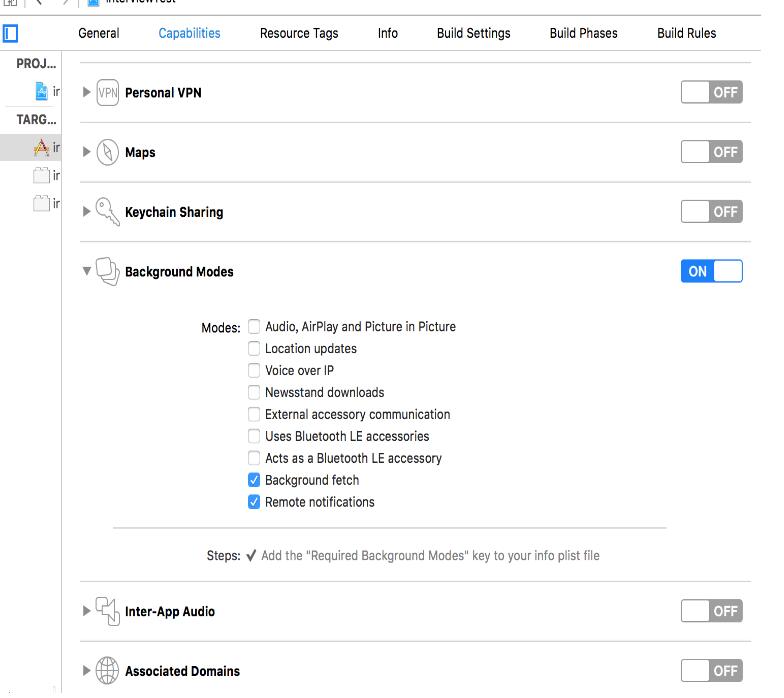 解决方法:PORJECT --> Capabilities --> Background Modes --> Background fetch & Remote notifications -->选中为on 状态