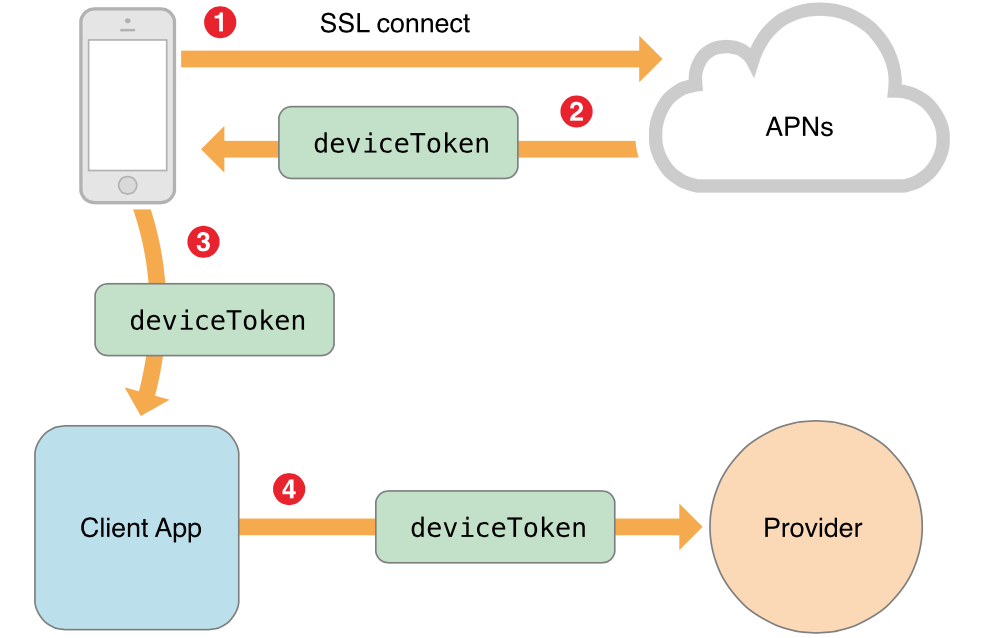 ①当用户同意app接收远程消息推送后,手机会向APNs发起一个请求去获取deviceToken;