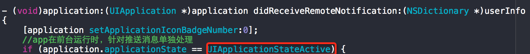 屏幕上会出现通知提醒,如果点开消息进入app,app运行到前台时会调用“didReceiveRemoteNotification”方法,这也就是之前为什么要区分一下applicationState的原因,因为二者都是通过这一步来处理。