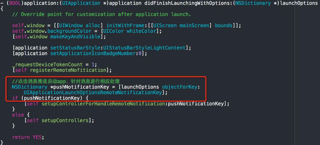 同样屏幕上出现通知提醒,点开消息进入app,启动时“didFinishLaunchingWithOptions”方法里的launchOptions对应UIApplicationLaunchOptionsRemoteNotificationKey部分内容不再为空,含有的即是推送内容,针对处理即可。