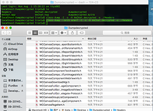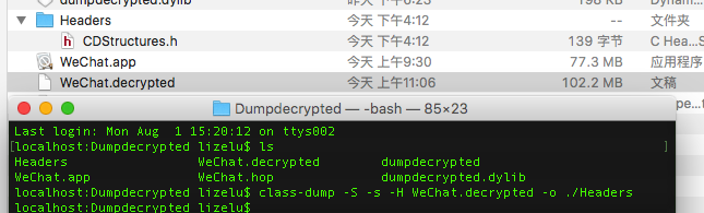 将上面生成的WeChat.decrypted脱壳文件拷贝的我们的Mac上,接下来就是我们class-dump出厂的时刻了。接下来我们要使用class-dump导出该脱壳文件的所有头文件。具体步骤如下所示。