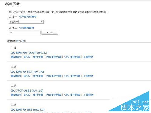 2、在官网的首页进入<档案下载>页面,然后可以按产品类型和关键字来找相应的驱动,如下图所示,如果对芯片组清楚就选第一项,不然还是选关键字来进行查询,找到相应主板后,选择bios进入。