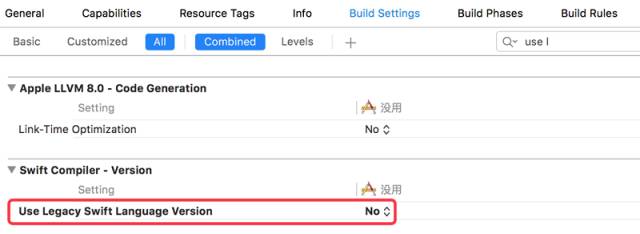 如果不想立刻就迁移到Swift3,可以在Builder Settings中进行设置,选择Use Legacy Swift Language Version设置为YES,就可以继续使用旧版本的Swift2.3。
