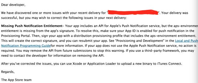 但是在用Xcode8打包后,并且不对代码进行修改的情况下,会发现打包后苹果发来了一封邮件。这封邮件大概意思是如果需要使用推送通知,需要对代码做修改,否则将不能使用推送通知。