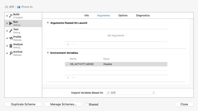 在Target -> Edit Scheme -> Run -> Arguments中,添加OS_ACTIVITY_MODE字段,并设置为Disable即可。