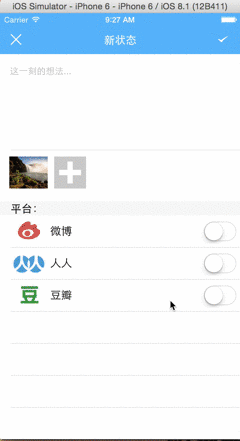 主要是使用UICollectionView来动态加载分享图片内容,配合预览页面,实现动态添加和预览删除图片效果。