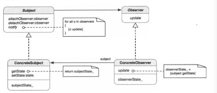 观察者模式本质上时一种发布-订阅模型,用以消除具有不同行为的对象之间的耦合,通过这一模式,不同对象可以协同工作,同时它们也可以被复用于其他地方Observer从Subject订阅通知,ConcreteObserver实现重现ObServer并将其重载其update方法。一旦SubJect的实例需要通知Observer任何新的变更,Subject会发送update消息来通知存储在其内部类中所注册的Observer、在ConcreteObserver的update方法的实际实现中,Subject的内部状态可被取得并进行后续处理。其类图如下: