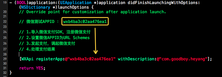 我们可以打开微信支付平台下载的Demo程序,可以在它的AppDelegate的源码中找到测试用的APPID: