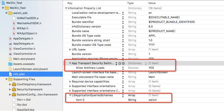<key>LSApplicationQueriesSchemes</key> <array> <string>weixin</string> </array> <key>NSAppTransportSecurity</key> <dict> <key>NSAllowsArbitraryLoads</key> <true/> </dict>