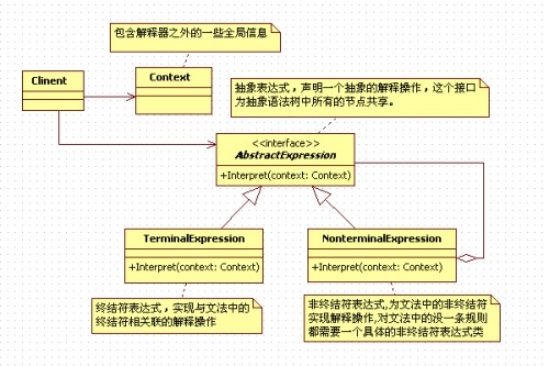 图中的结构也比较好理解,解释器方法抽象出一个统一的接口(AbstractExpression),于需要解释的内容(Context)做了解耦,调用时为具体的解释器方法传入内容(Context)从而实现相应的解释功能。