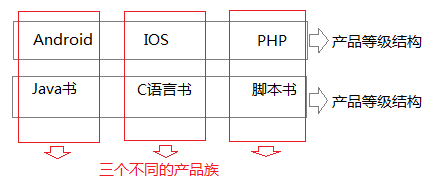 产品等级结构:就是继承结构。就像上面Android,IOS,PHP这些技能继承自一个抽象的技能类(譬如前面的ICode),这个抽象类与这些子类构成了产品等级结构。 同理的Android书,C语言书,脚本书继承自一个工具书类,这个工具书抽象类与这些子类构成了等级结构。