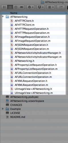 当你解压出下载的文件后,你将看到其中有一个AFNetworking子文件夹,里面全是.h 和 .m 文件, 如下高亮显示的: