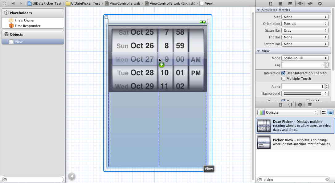 2、单击ViewController.xib,打开Interface Builder。拖一个UIDatePicker控件到视图上: