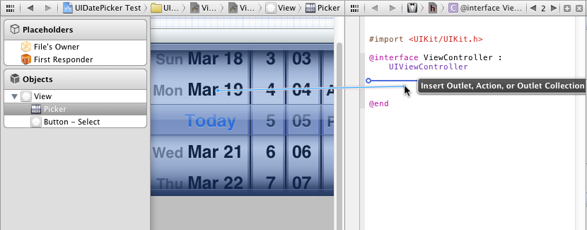 4、创建映射:打开Assistant Editor,选中UIDatePicker控件,按住Control,拖到ViewController.h中: