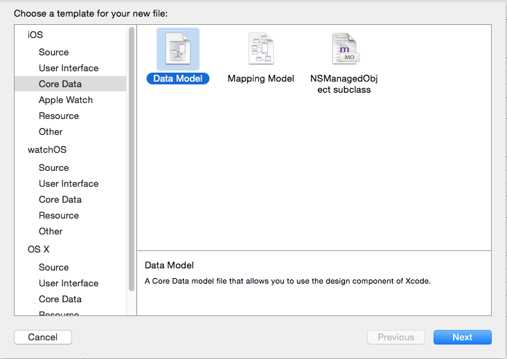 使用Xcode创建一个工程,在工程中新建一个文件,选择Core Data分类中的DataModel创建,如下图: