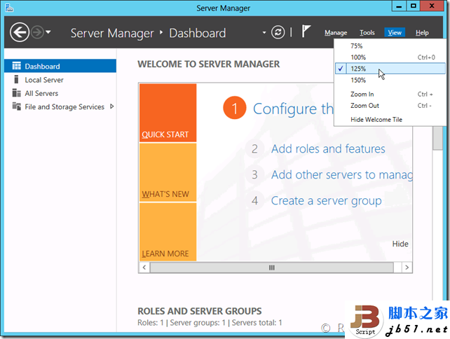 查看:在查看里,我们可以调整整个面板的显示大小,可以更加方便的在不同设备上切换,比如平板和高分辨率的显示器之间。帮助:这里主要显示服务器管理器的帮助信息,比如帮助文件、TechCenter、TechNet Forum等。