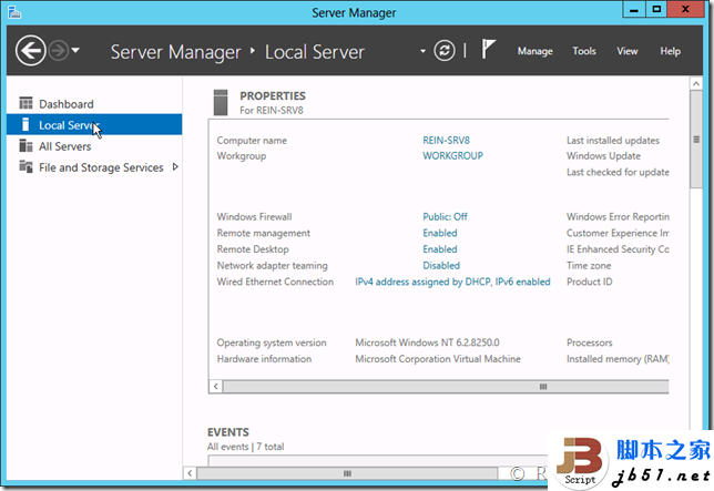 默认情况下是显示我们的仪表盘,即服务器管理器的欢迎界面和一些重要信息,比如服务器事件、日志等信息。我们来看下本地服务器中显示的内容: