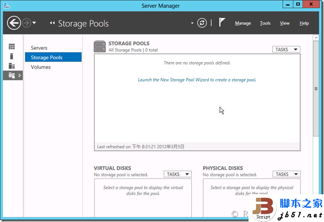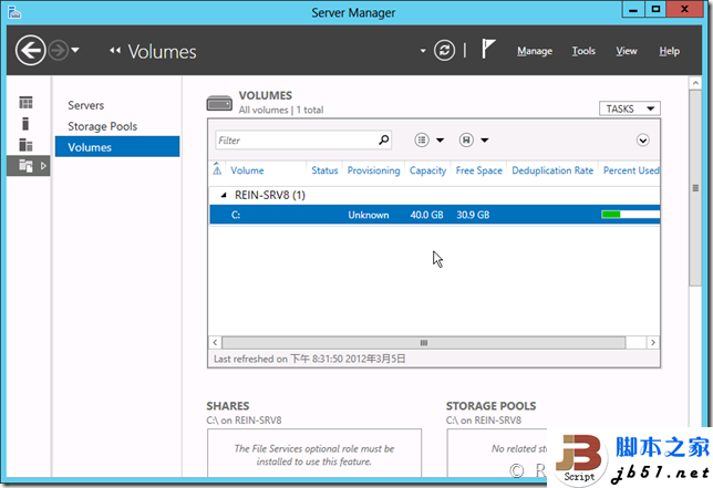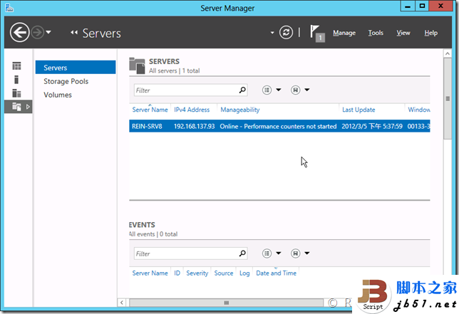 接下来是文件和存储服务,这也是Windows Server 2012变化很大的地方,文件和存储服务又分为三块,分别是服务器、存储池以及卷。服务器块主要显示当前所管理的服务器,可以将多个服务器进行同时的管理,还可以使用各种筛选设置来选择指定的服务器。