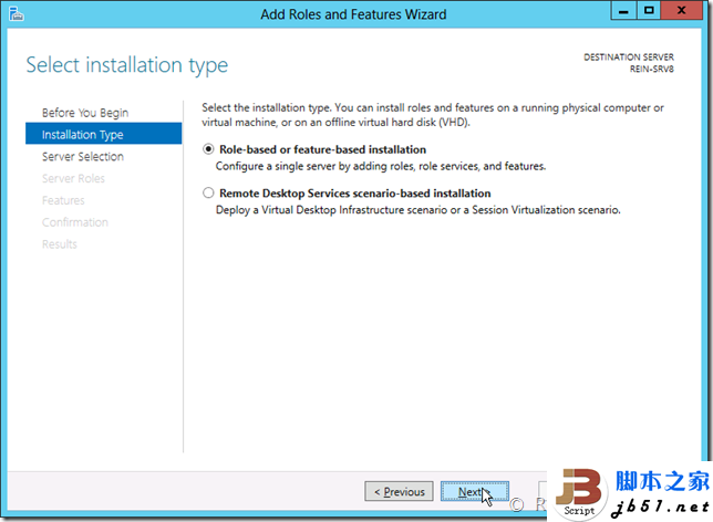 接下来的一步与旧版本的Server完全不一样,会提示选择是“基于角色或基于功能安装”还是“基于远程桌面服务方案安装”。Windows Server 2012把Server划分成了两类,一类是传统的,一类是用于云计算虚拟化的。