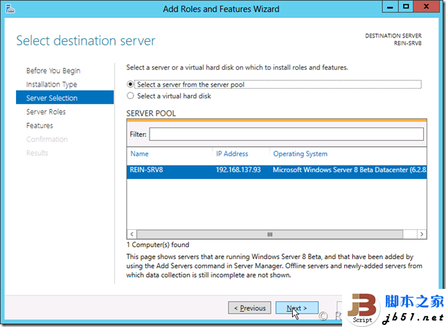 之后会提示选择要添加角色或功能的服务器,可以选择本地的、局域网中的、服务器组中的,并且还可以选择基于虚拟磁盘的离线服务器,这里选择本地服务器。